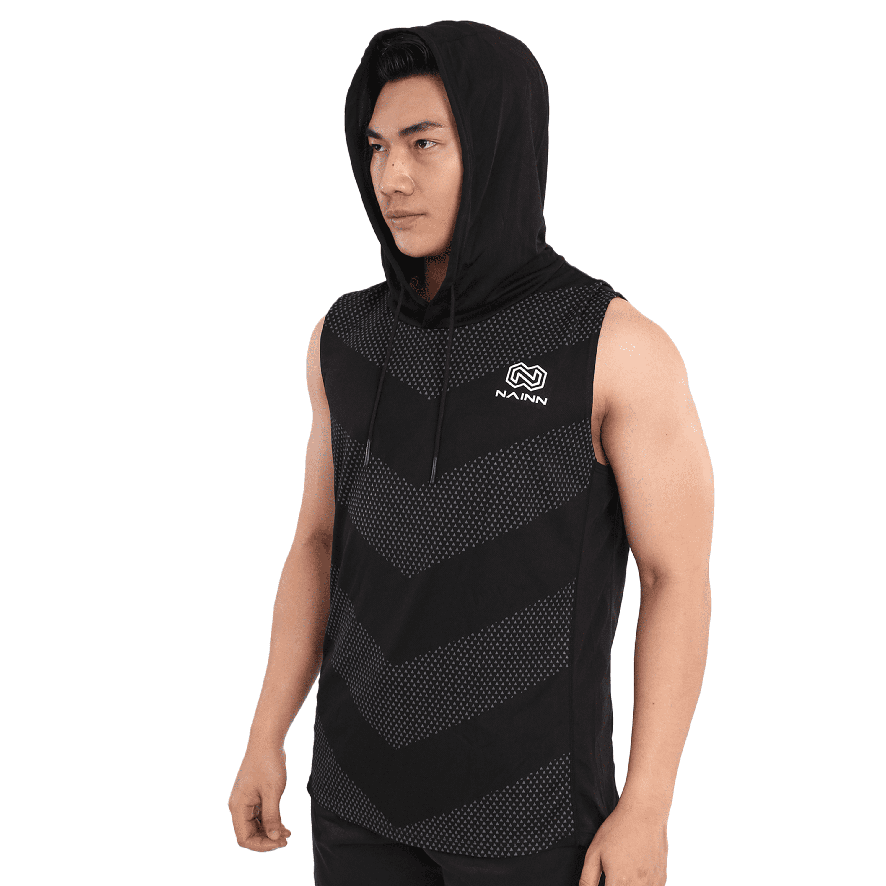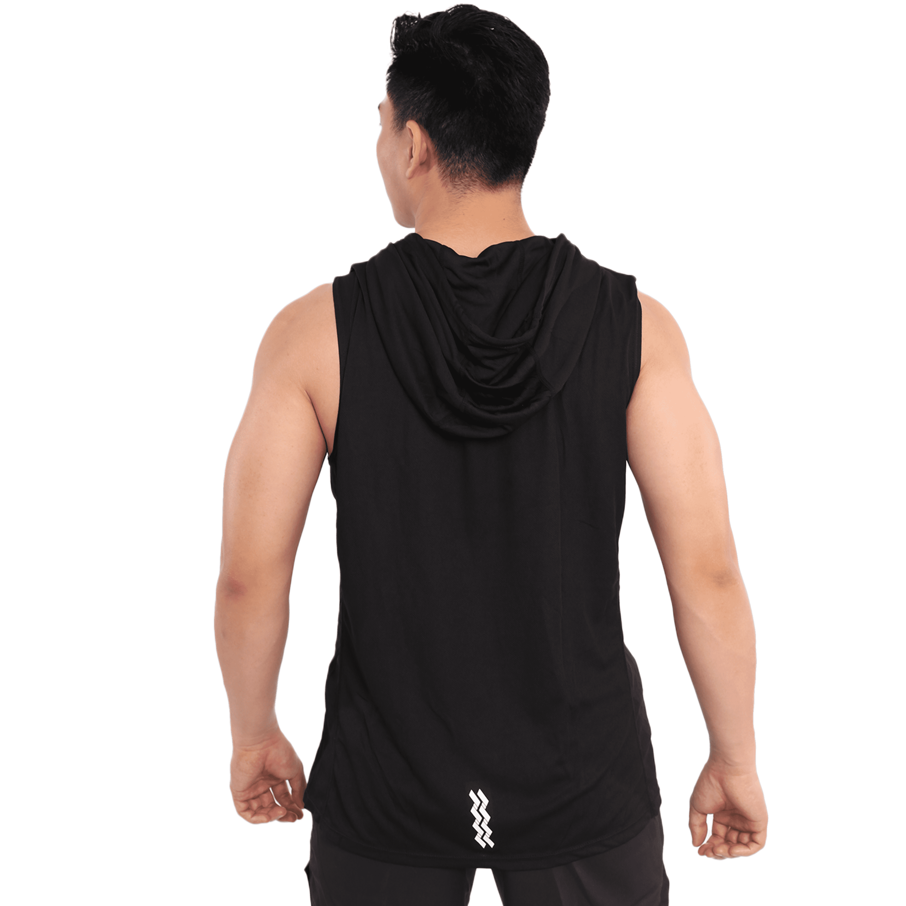 Hoodie sleveless berwarna hitam, cocok dipakai saat berolahraga