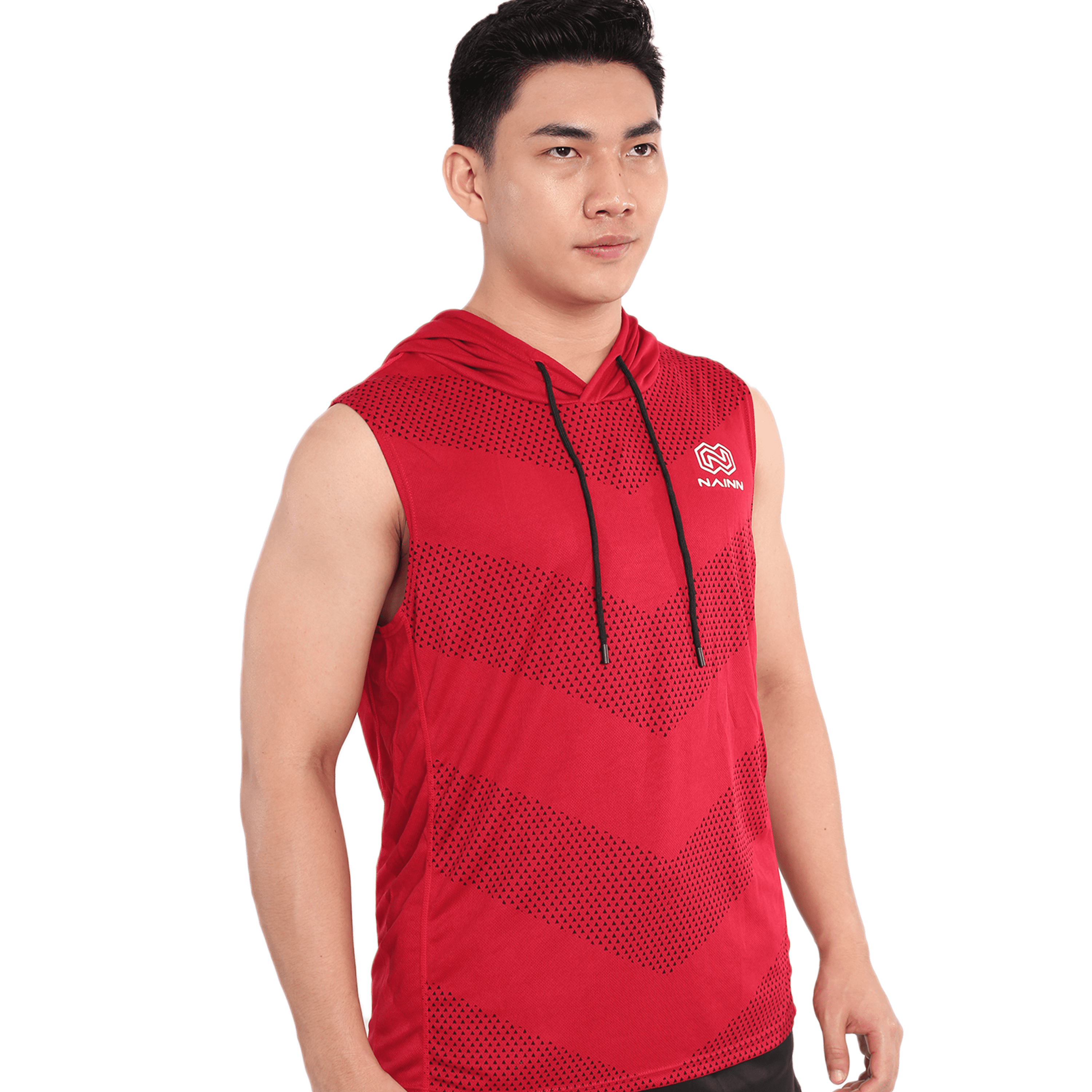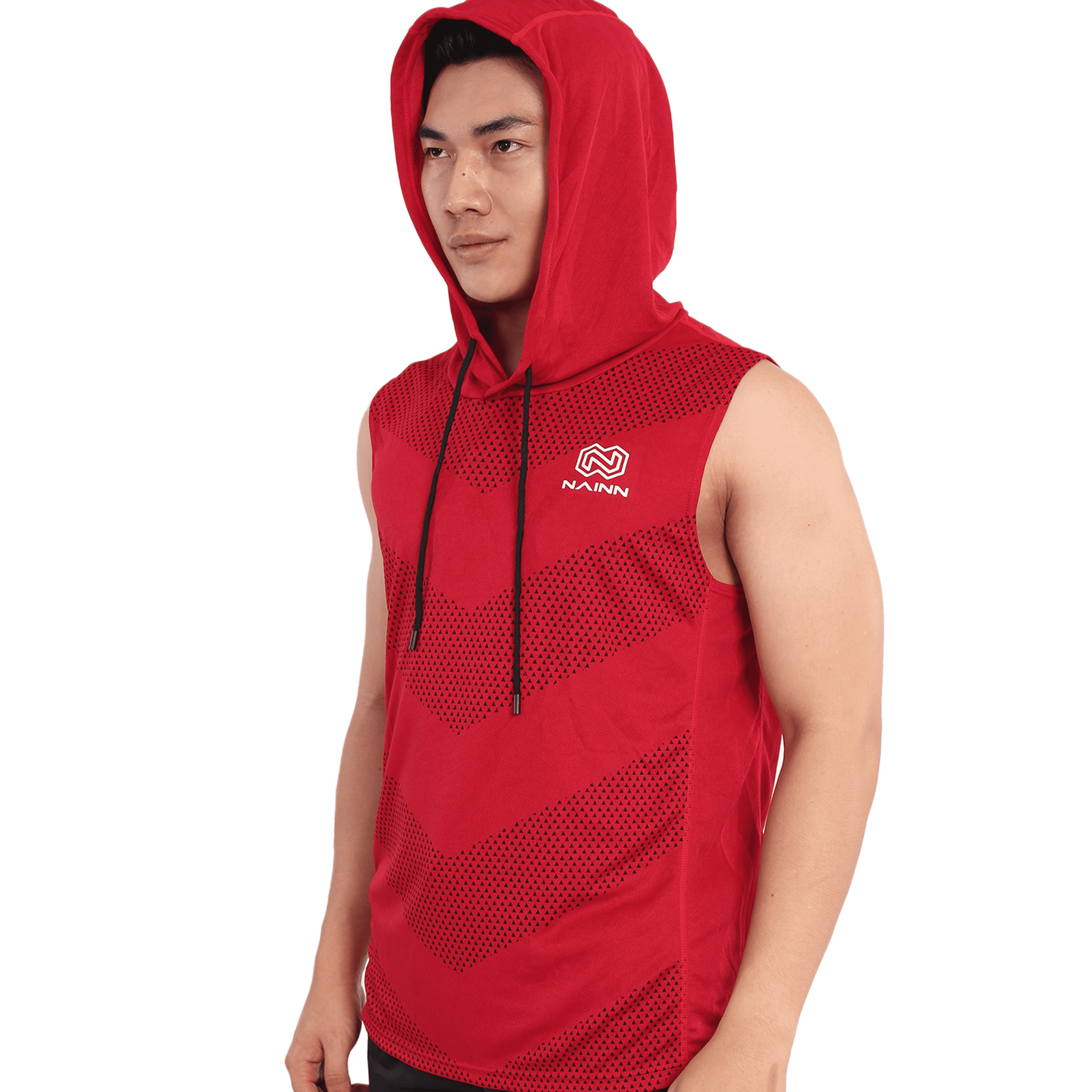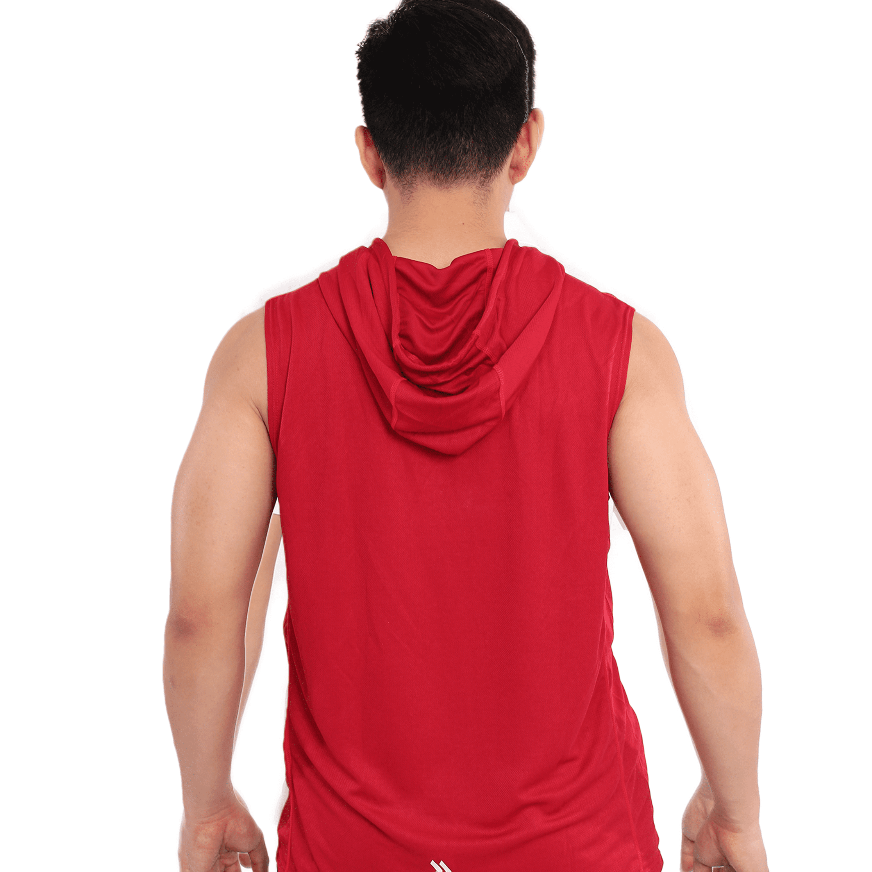 Hoodie sleveless berwarna merah, cocok dipakai saat berolahraga