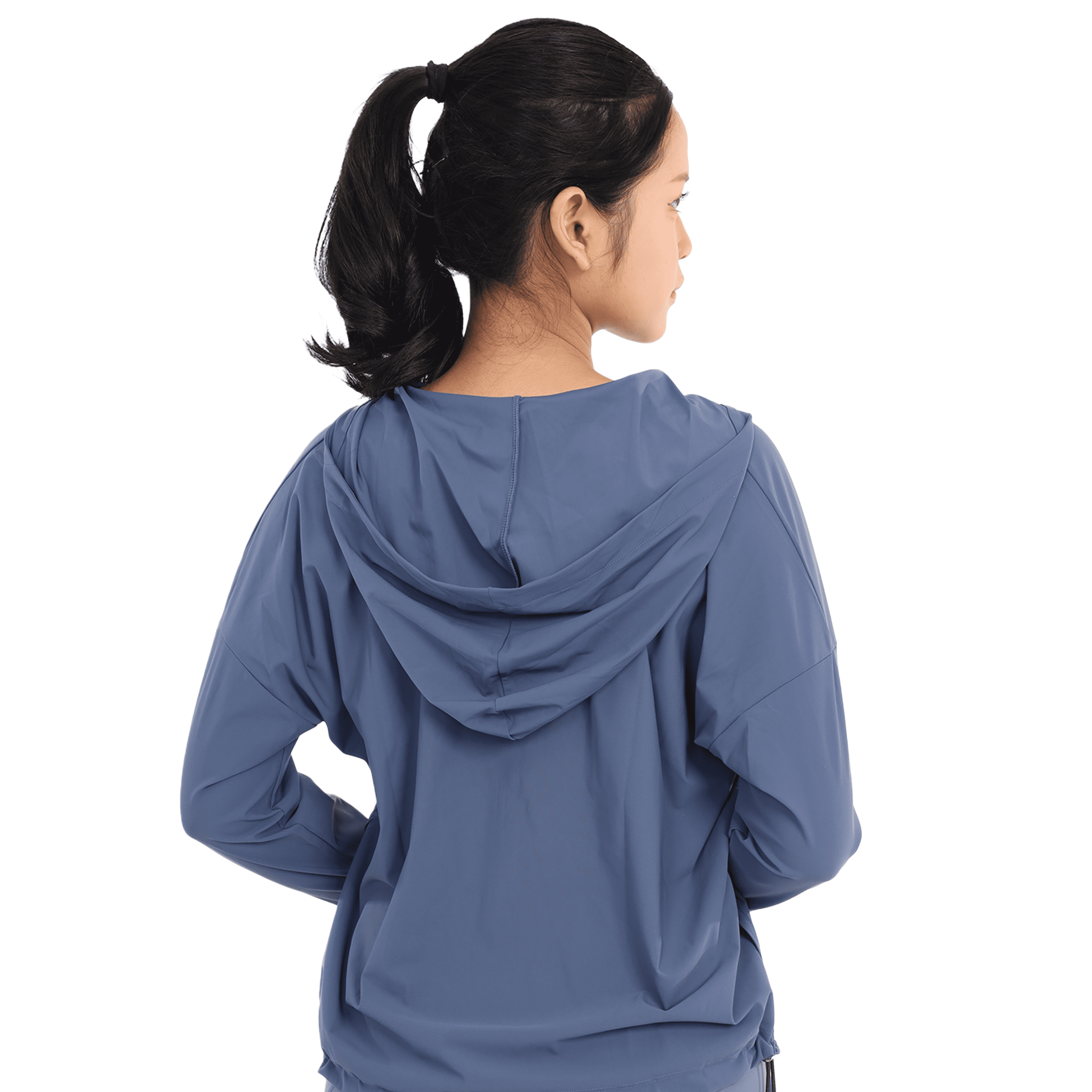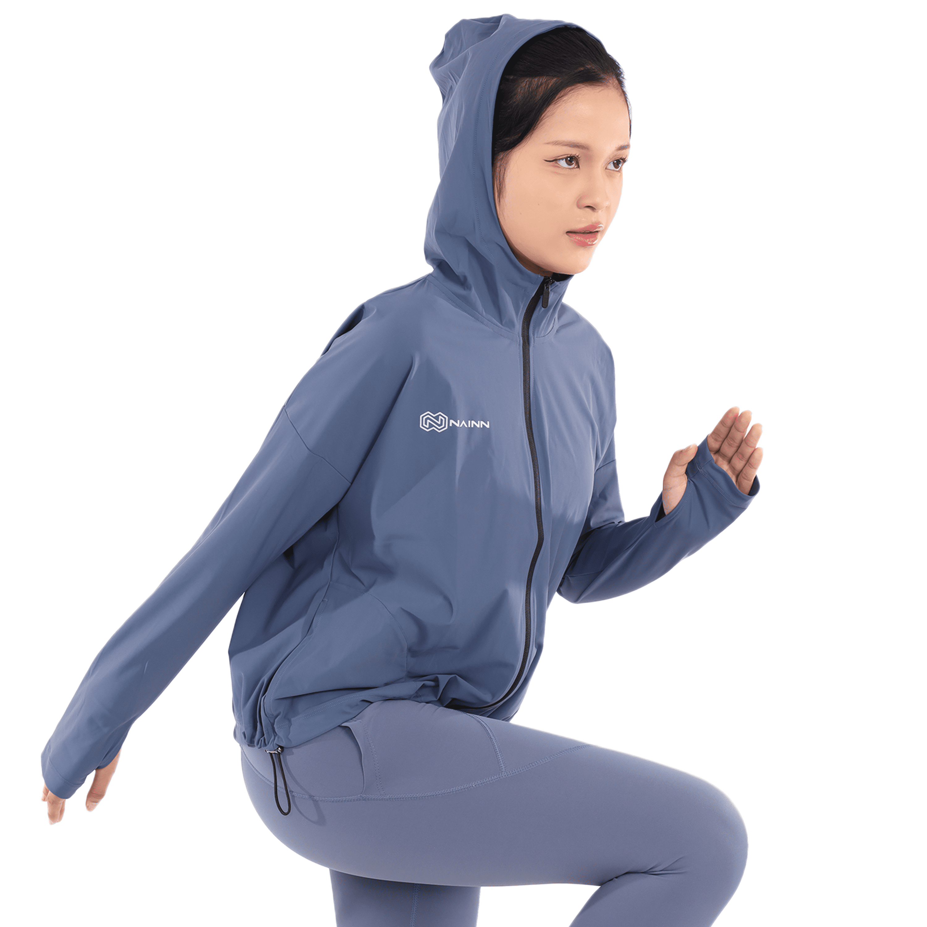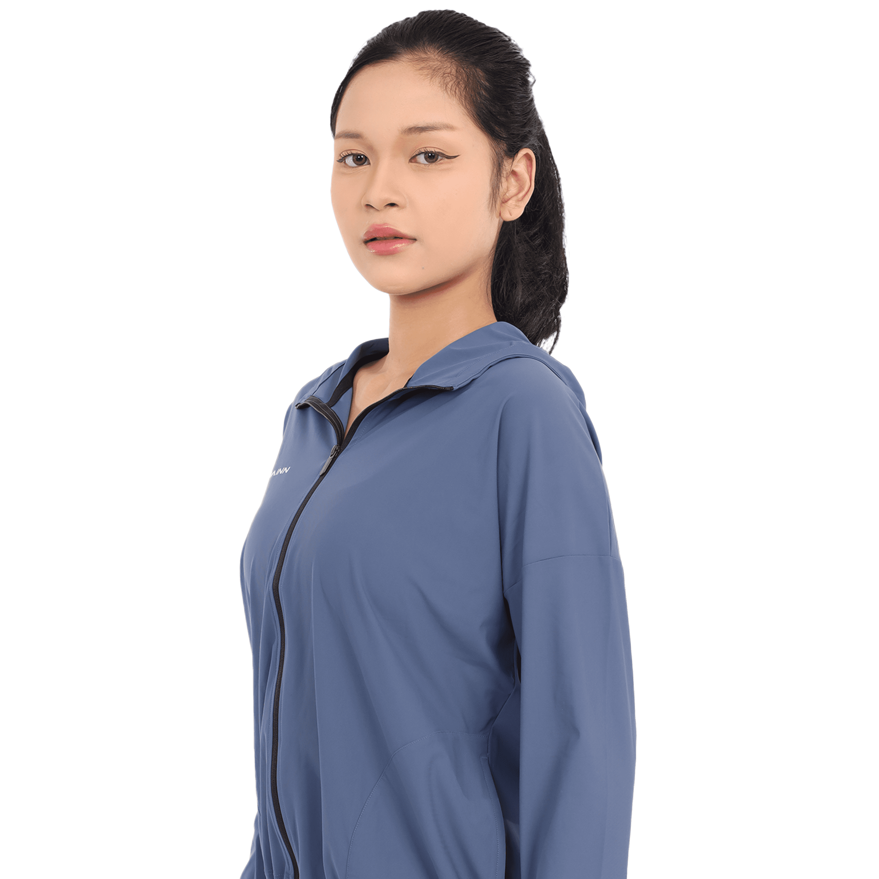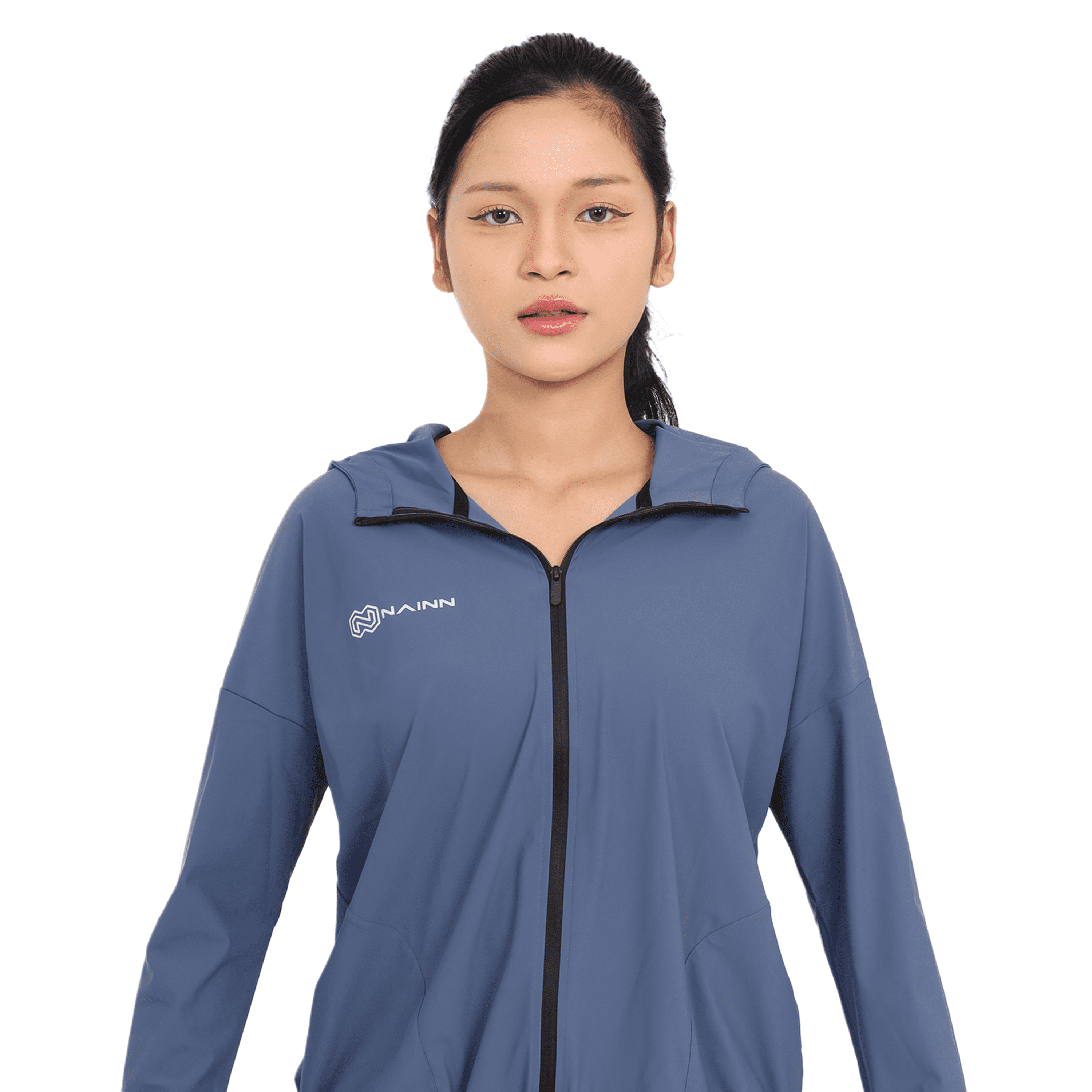Jacket Windbreaker warna navy, cocok dipakai saat berolahraga, memiliki kantong pada bagian samping untuk menyimpan barang